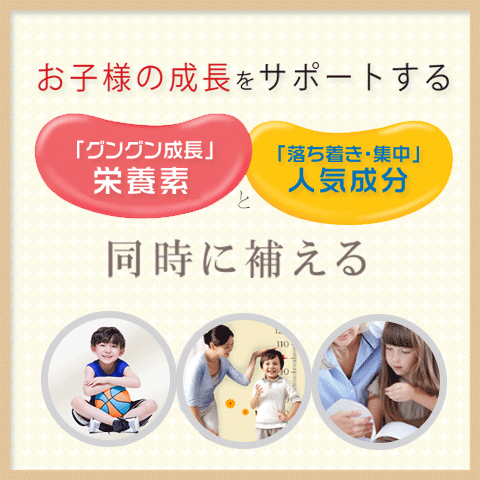 ●「グングン成長」と「集中力」に必要な栄養素を同時に補える「次世代型総合栄養素」 新しいことをどんどん覚える成長期のお子様には、体の成長とともにアタマやココロがしっかりと働くための栄養素が大切です。