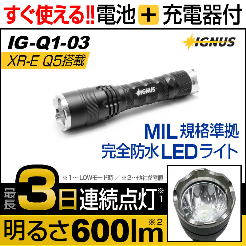 懐中電灯 充電式 防水 led 明るい 最強 フラッシュライト 強力 LEDライト ハンディライト イグナス ショットガン LED懐中電灯 【電池・充電器セット】