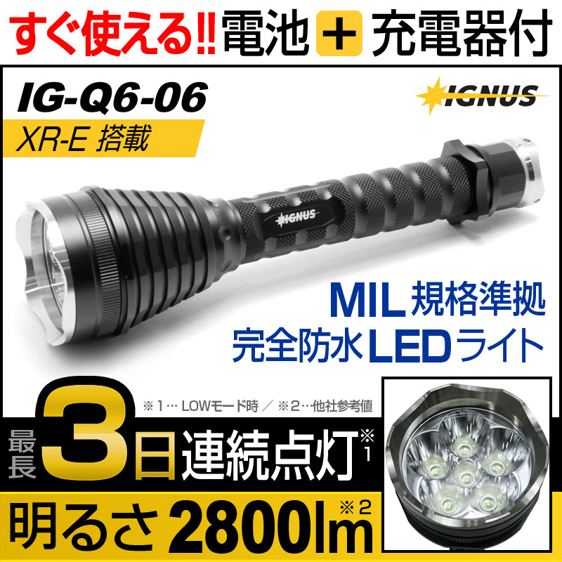電気用品安全法(PSEマーク)取得済み 仕様 【メーカー名】 Bonds&Bonfires (ボンズアンドボンファイヤーズ) 【ブランド名】 IGNUS (イグナス) 【製品呼称】 STEALTH (ステルス) 【品番】 IG-Q6-06 【ライト光束 ルーメン数】 最大:約2800ルーメン(他社参考値) 最大:約1445ルーメン(当店実測値) 【照射距離】 最長 約1100M以上 【照射モード】 5モード(Hi / Mid / Low / FLASH / SOS) 【点灯時間】 Low: 約105時間 Mid: 約1.4時間 Hi: 約1時間 ※2 【MIL規格】 MIL-STD-810G / MIL-A-8625 【JIS保護等級】 IPX6 完全防水 / IP5X 完全防塵 【光源】 CREE社 XR-E Q5×6灯 【サイズ】 全長230mm 【重量】 約400g (電池含まない) 【使用電池】 ・18650リチウムイオン電池 2本 【セット内容】 ・本体 ・専用充電器 ・取扱説明書 ・18650リチウムイオン電池 2本 注意事項 ・保障期間はキャンペーン価格のため3ヶ月になります。
