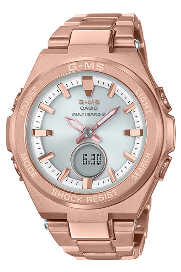 型番 MSG-W200DG-4AJF ケース材質:合成樹脂サイズ約:縦48×横38mm重さ約:80gベルト材質:ステンレススチールカラー:ピンクゴールドベルト腕周り最少:13cmベルト腕周り最大:18cmムーブメントソーラー(電池式)機能風防:ミネラルガラス留め金 三ツ折れプッシュタイプ中留耐衝撃構造 電波受信機能:自動受信(最大6回/日)(中国電波は最大5回/日)/手動受信、対応エリア/日本・北米地域・ヨーロッパ地域・中国*ホームタイム設定を受信可能な都市に設定すると、都市に合わせた局を受信します。