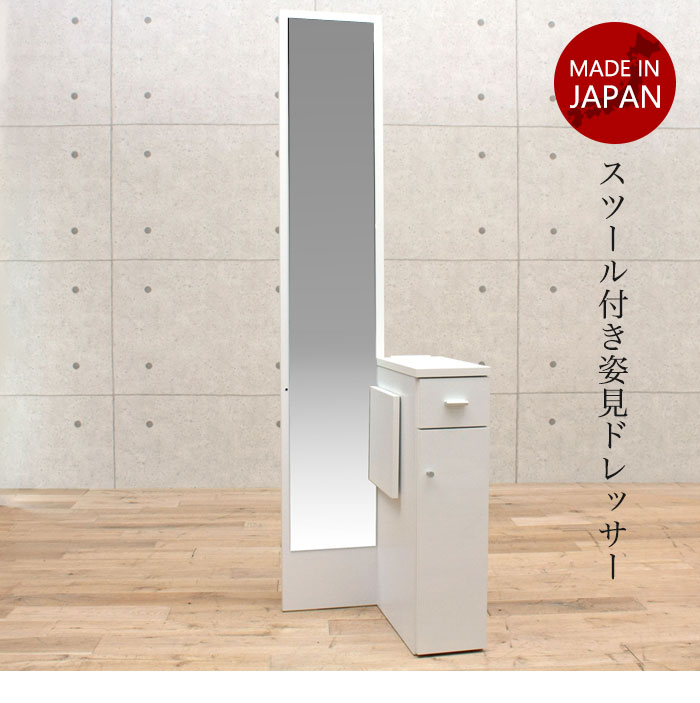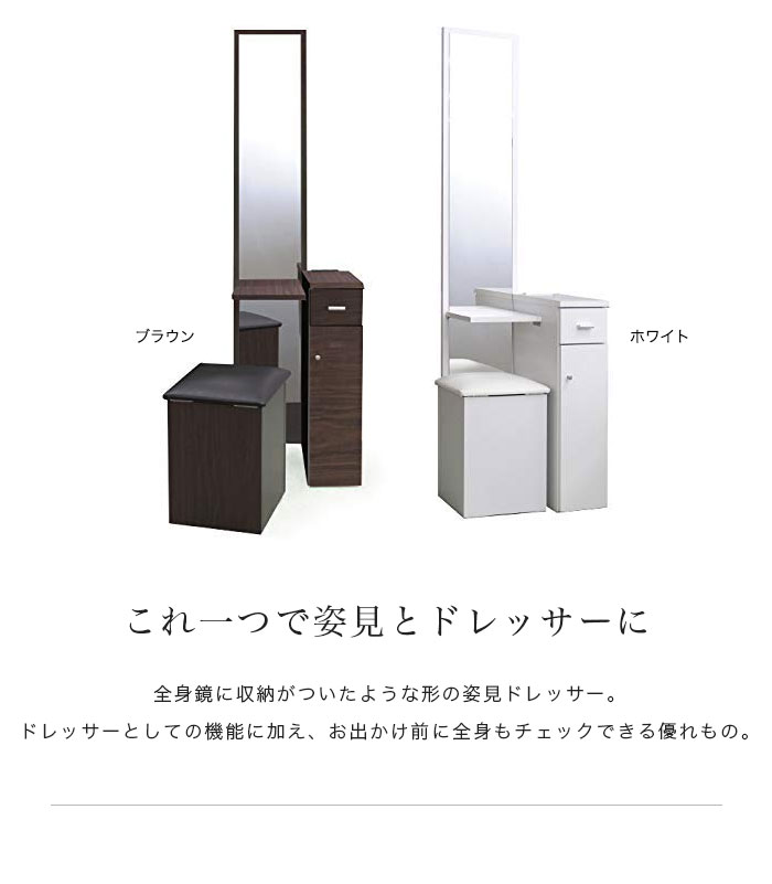 商品詳細 サイズ 本体サイズ:幅46.6×奥行42×高さ170cm 仕様 前面材質:MDF強化シート貼り(BR) 、MDFハイグロスシート貼り(WH) 椅子:PVC貼り 商品説明 確かな収納力と見やすい縦長ミラー。